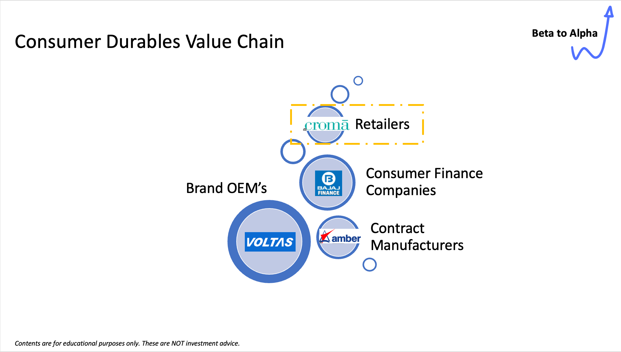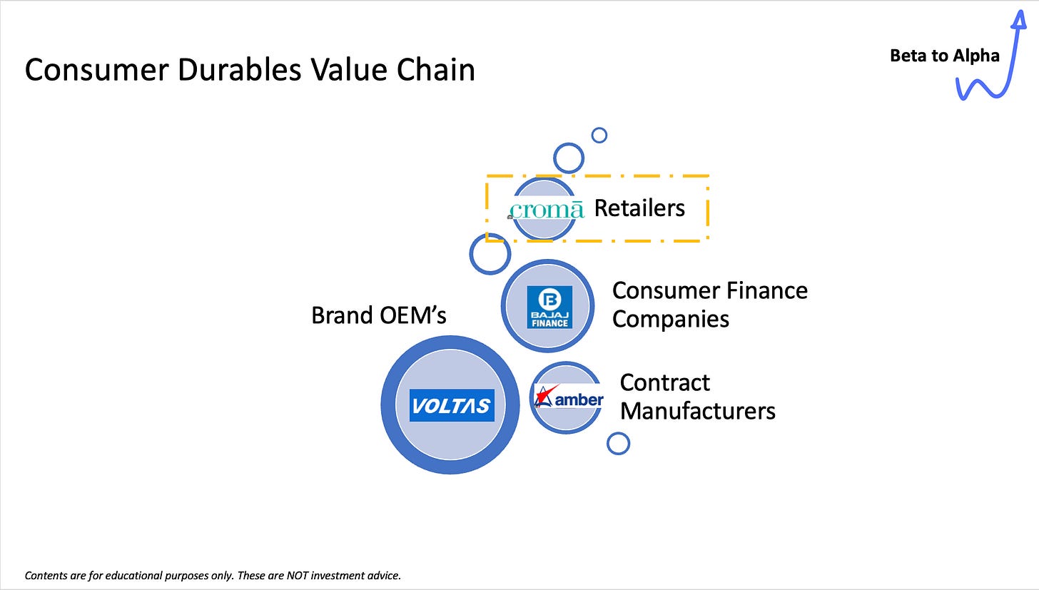 What’s often overlooked? Retailers. Where do you shop for that Voltas AC? It could be a Croma, Reliance Digital, Vijay Sales, or a local retailer with a strong regional foothold. These players are the bridge between production and the end consumer, playing a crucial role in driving demand. Without them, the value chain would stall.